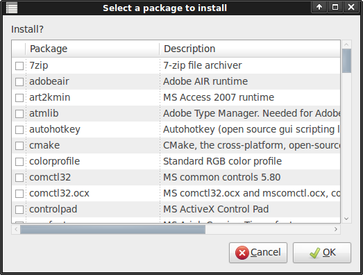 В случае, если winetricks был установлен из репозиториев дистрибутива, нужно выполнить команду winetricks в консоли, если загружен отдельно, то sh ./winetricks из того каталога, куда он был загружен. Когда winetricks запущен без дополнительных параметров, открывается графический интерфейс со списком доступных пакетов. В нашем случае необходимо выбрать gdiplus, ole2, vb6run, vcrun6, allfonts, winxp и нажать ОК.