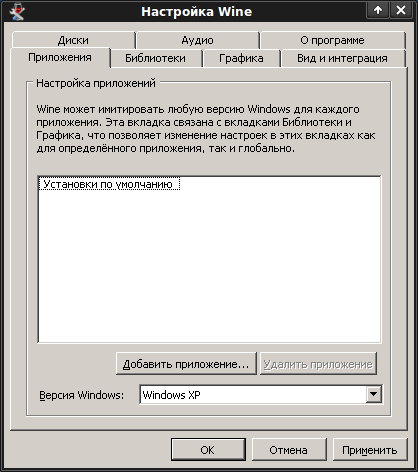 (или поищите в системном меню Configure Wine) для запуска утилиты конфигурирования. Утилита создает каталог ~/.wine в домашнем каталоге, позволяет выбрать «эмулируемую» версию Windows для каждого приложения, настроить графику, использование библиотек и т.д.